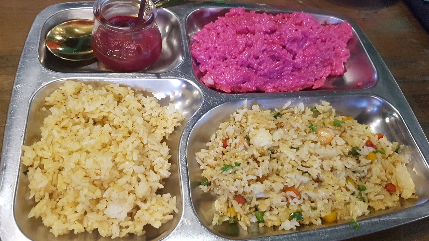 특히 분홍색밥이 코코넛 향이 나서 부드럽고 엄청!! 맛있었어요. 밥만 먹어도 맛있었어요. 음식 맛은 다 맛있었어요. 새우도 크고 살짝 매콤한데 안에 치즈 같은 게 있어서 고소했어요. 그리고 닭고기랑 채소랑 소스까지 해서 싸서 먹으니 입안에 가득 차는 그 느낌이 너무 좋았어요... 누구나 아는 맛이지만 맛이 없을 수 없는 조합이었어요.